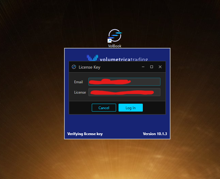 Download and launch Volbook. Youll need to use your email (same as the one used to log into your Trade Desk), and the license that was provided to you in your dashboard.