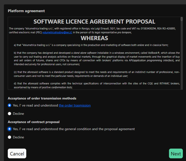When you select Volumetrica platforms, you will need to accept the license Agreements first