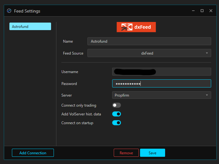 Use your Trade Desk credentials, select “dxFeed” as your feed source, and toggle “historical data” and “Connect on startup”. Save your settings.