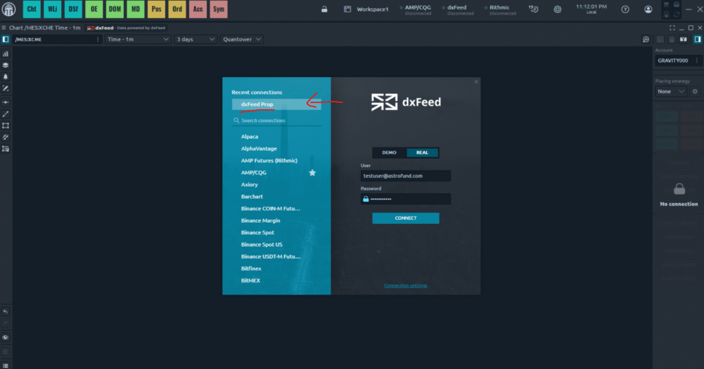 Sign up for an Astrofund account and select “Quantower” as your platform options from within your Trading Dashboard [See: Selecting a Platform]. You will receive login credentials via email. - Open Quantower and Access Connections