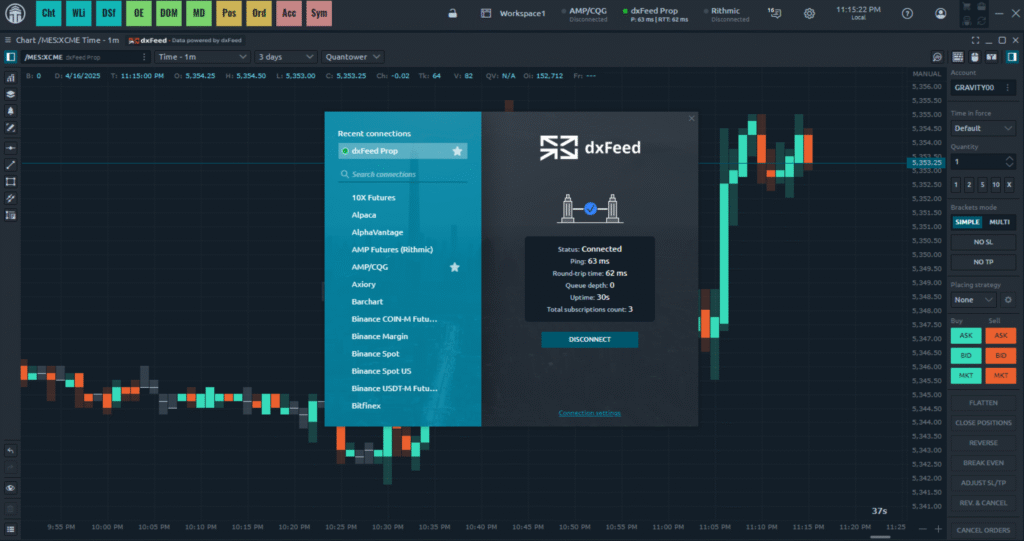 A successful connection will be indicated by a green status dot next to dxFeed Prop in the Connections Manager.